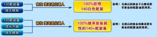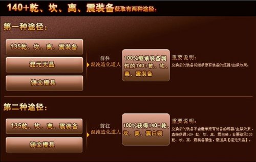 1、每个等级的装备仅对应乾、坤、离、坎、震5个系列。每个系列每等级均只有一套装备。 2、同样,青云135乾武器只有一种。早起活动有自定义名称的款式,需要充值达到一定金额获得,该活动已经结束,现在已经不可能获得【命名武器】了 3、兑换NPC:120及135乾武器在青云太上道德天尊处兑换;120及135级乾衣服头鞋在混沌地图门派使者处兑换;140+乾离坎震所有装备均需持对应的135级同系列装备与对应的铸文道具在混沌地图NPC处合成。 4、五系列装备各有侧重,主要是附加属性不同 坤【+8出第一重属性,+10出第二重属性】:主要强化命中、躲闪、减免伤害、攻击,适合挂机 乾【+9出第一重属性,+11出第二重属性】:极度强化爆率、极度强化暴击伤害、中度强化真气、中度强化气血,中度强化技能躲闪,中度强化技能命中;由于此套装备可交易,故适合PK型大众 离【+9出第一重属性,+11出第二重属性】:较高强化爆率、较高强化暴击伤害、极度强化真气、中度强化技能躲闪,中度强化技能命中;该套装备适合对蓝有极大需求的职业PK用,如天华、鬼王。 坎【+9出第一重属性,+11出第二重属性】:较高强化爆率、较高强化暴击伤害、极度强化气血、中度强化技能躲闪,中度强化技能命中;该套装备适合对气血有极大需求的职业PK用,如合欢、怀光、烈山、九黎、天音等。 震【+9出第一重属性,+11出第二重属性】:较高强化爆率、较高强化暴击伤害、额外强化抗性、中度强化技能躲闪,中度强化技能命中;该套装备适合对抗性有极大需求的职业PK用,如怀光、天华、魔鬼道等。 更详细的说明请参考多玩资料专题【参考资料中的链接即是,但知道可能会屏蔽链接】 5、获取方式: 坤:使用胜石在河阳门派使者处或神裔门派使者处兑换 乾:使用龙筋【可通过凌霄副本、天帝宝库副本掉落获得,也可通过算卦及八荒火龙任务获得】在青云太上道德天尊处兑换武器;在混沌门派使者处兑换衣服套装 离:使用楚汉青钱在河阳宝塔下的NPC处兑换【楚汉青钱每周参加周六、周日下午的楚汉军魂战场完成任务换取】 坎:使用天空宝珠及仙基在战场使者处兑换【只能通过刷飞升战场获得】 震:通过击杀冥界BOSS掉落【普通地图】,也可通过击杀天界BOSS掉落【天界地图】,这款装备凑齐的难度较大 以上的装备升级140+套装时均需要通过铸文合成,龙筋可以用于兑换所有系列的可交易铸文。战场珠子可兑换无法交易的坎铸文;楚汉青钱可兑换无法交易的离铸文;坤装只有135系列,官方表示不会出140+系列坤装。 附135飞升装备升级方法: |