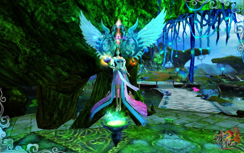 【天界净土,从未有人踏足之地】 通过天界之门,达到梵天净土。瑰丽的色彩,奇异的物种,梵天净土有着与人间天差地远的异域风情。各种神奇的物种在这里滋养而生,幽静的圣坛为你带来神圣的感觉。这便是首张天界地图“梵天净土”。 天界的异域风情 美丽的天界NPC