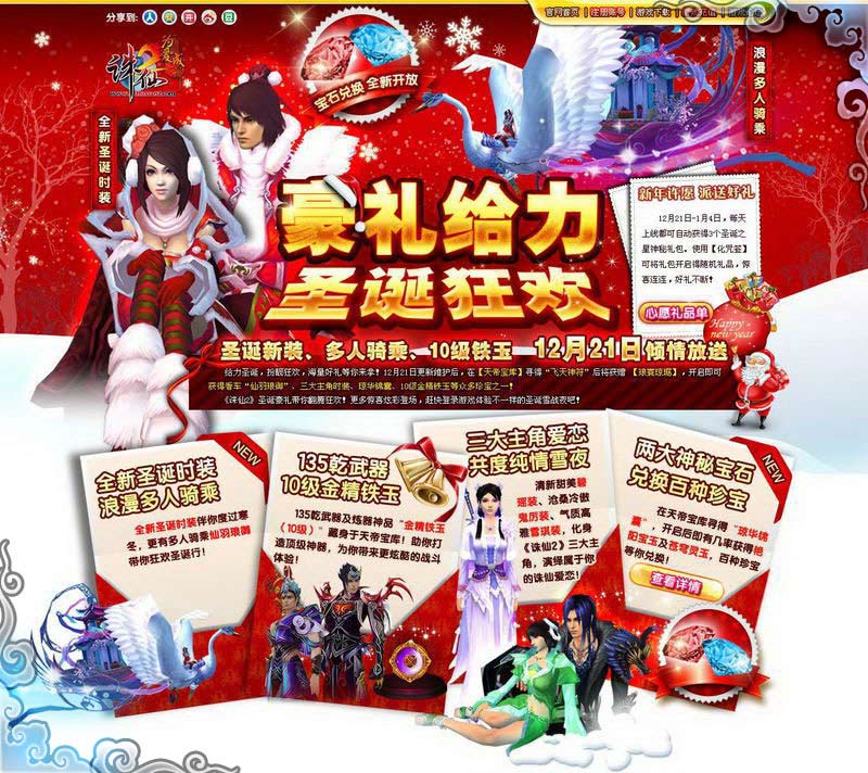 再有4天,就要迎来2011年了。穿上全新2010年华丽圣诞装,驾驭全新多人骑乘“仙羽琅御”,用宝石换取你喜爱的珍宝,《诛仙2·为爱成神》与你一起迎新年! http://event51.wanmei.com/zhuxian2/201012/hl/index.htm 登录专题页了解更多精彩内容
