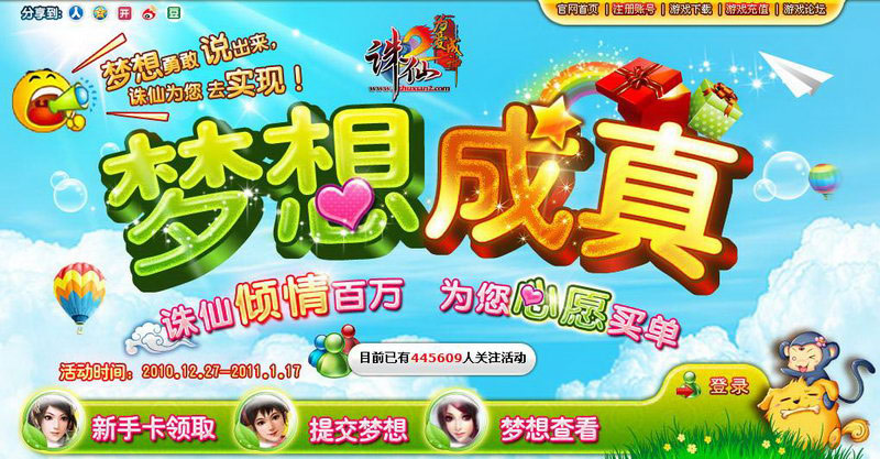 【你许愿,我买单!45万玩家关注的焦点!】 1月7日前,登录http://event21.wanmei.com/zhuxian/201012/dreamscometrue/index.jsp《诛仙2·为爱成神》美梦成真专题页,大胆写下你的梦想你的心愿,官方每周将选取10名幸运玩家,实现TA的梦想! 现在,已有近45万名玩家在关注这个活动!玩家在专题页面还可以为你支持的梦想投票。在梦想支持排行榜名列前茅之人,还将获得10级金精铁玉、诺基亚手机、Razer键鼠套装、游戏内专属坐骑、飞剑、宠物、尊号等超值奖励! http://event21.wanmei.com/zhuxian/201012/dreamscometrue/index.jsp 大胆说出你的愿望,《诛仙2·为爱成神》为你实现! 【签到领取元神修为珠倒计时】 1月3日23:30前,每个账号每日到 http://event20.wanmei.com/zhuxian2/zhuxian2opendoor/zhuxian2Door!login.action 《诛仙2·为爱成神》问鼎蟠龙专题页 签到,就可以免费领取1积分,每5个积分可兑换【50*5个元神修为珠】!积分免费领取即将在1月3日23:00结束,可不要错过哦! 全民签到,登录即可参加抽奖,还有更多好礼等你赢取,更多详情,请登录http://event20.wanmei.com/zhuxian2/zhuxian2opendoor/zhuxian2Door!login.action 《诛仙2·为爱成神》问鼎蟠龙专题页 查看! http://event20.wanmei.com/zhuxian2/zhuxian2opendoor/zhuxian2Door!login.action 签到领大礼,还能参加抽奖活动哦!