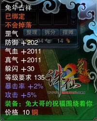 上线就送礼,兔年特别版罡气等你拿! 即日起至2月15日,所有角色每日登录游戏即可获赠5个“兔年吉祥礼盒”,开启即送365颗造化珠,还有机会获得具有超强属性状态增益的兔年特别版罡气、千华龙筋、元神修为珠、天龙魔血等超值修真珍宝!并且这个特别版罡气还可以交易哦! 开启“兔年吉祥礼盒”需要使用特殊的道具“化咒签”,到“天帝宝库”就能找到这个特殊道具。 活动时间:1月18日-2月15日 参与等级:全民都可参加 强力装备——兔年特别版罡气 放飞大红灯笼祈福新年,领超大型红包,收神秘大礼! 2月7日前,所有60级以上的玩家都可以到河阳草庙村找到郭元振(-391,420),在他的指引下放飞写有你名字的大红灯笼!放飞红灯笼为新年祈福,除了能收到太极金丹和造化珠奖励之外,还会收到一个神秘的“大红包”。想知道红包里面有什么?那就等到2月15日去打开来看看吧! 点燃红灯笼需要一定的时间,玩家在郭元振处领取完任务后,请耐心等待一小会儿,写有你名字的红灯笼就会慢慢升起! 活动时间:1月18日-2月7日 参与等级:60级以上玩家可参加一次 活动NPC :河阳草庙村 郭元振(-391,420) 大红灯笼欢庆新年 搞怪飞骑“看飞机”和坐骑“吉祥”也来送祝福! 《诛仙2》新年祈福版狂欢盛典等你来参加!到《诛仙2》里HAPPY一下,还有超多的兔年精品大礼送给你!更多精彩内容,敬请关注《诛仙2》官方网站! 进驻《诛仙2·为爱成神》1月7日新服新网通二区-逐日追风、新电信四区-傲雪欺霜领大礼 http://passport.wanmei.com/jsp/member/register.jsp《诛仙2》账号注册 《诛仙2·为爱成神》客户端快捷更新通道http://zhuxian.wanmei.com/download/index.htm《诛仙2·为爱成神》客户端下载攻略 真爱网游《诛仙2·为爱成神》 续写你我未完的爱恋! zhuxian2.wanmei.com |