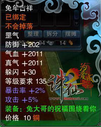 HAPPY指南——新春祈福,全民乐翻天 ☆变身可爱的萌兔宝宝在玄幻世界穿行!超值红包全民疯狂派送,2月15日前,在河阳、青云等地图打怪就有机会收取“兔年红包”,稀有变身道具、元神修为珠、太极金丹、金叶子、烟花等你领取! 兔宝宝贺新春 ☆全民狂欢上线就送礼!2月15日前每日登录游戏就能免费获得5个“兔年吉祥礼盒”,开启后不仅能获得365颗造化珠,还有机会获得具有超强属性状态增益的兔年特别版罡气、千华龙筋、元神修为珠、天龙魔血等超值修真珍宝!这个特别版的罡气还可以交易哦! 超强装备特别版兔年罡气 ☆大红灯笼高高挂!2月7日前到河阳草庙村找到郭元振,放飞新春祈福灯笼,不仅能收获金丹和造化珠奖励,还能收获一个神秘的“大红包”,2月15日,它会送你神秘大礼! 挂灯笼祈福