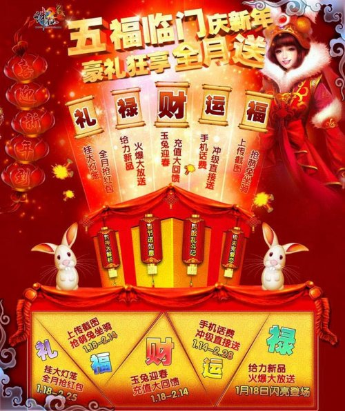 五福临门欢庆新年,《诛仙2》年味浓浓,新年豪礼整月送不停!穿新衣,备年货,体验乐趣无穷的新年狂欢! http://event51.wanmei.com/zhuxian2/201101/blessing/index.htm 登录专题查看《诛仙2》新年祈福版的精彩活动