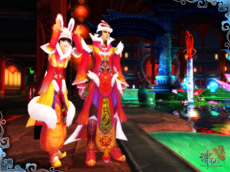 【2011年贺岁吉服——俏皮又可爱】 你有萝莉情结吗?《诛仙2》2011贺岁吉服女装将你装扮成一个俏皮可爱的小萝莉!兔耳帽、灯笼裤,2011贺岁吉服人气颇高!当然还有潇洒的2011贺岁吉服男装,大红长袍装扮你的男性魅力! 另外,这款情侣装不仅具有华丽的外形,还具有强效的专属时装技能!清除不利状态,让你瞬间提速,外加1小时攻击状态加成! 甜美小公主 2011贺岁吉服