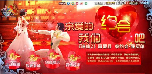 【怎么约会才够创意才够浪漫?秀出你的创意赢取真爱大礼!】 即日起至3月5日12:00,登录http://event21.wanmei.com/zhuxian/201102/truelove/index.jsp 《诛仙2》真爱月 你约会我买单 专题页,上传你的约会创意,就有机会获得情侣手机、《诛仙2》情侣吊坠、绝美情侣时装、经典情侣坐骑、游戏点卡等超值好礼!并且,你还有机会赢得官方准备的“约会基金”哦! 登录专题页上传你的精彩创意 绝美人气情侣时装“天缘装” 双龙坐骑“敖弘”、“敖蒙” 《诛仙2》浪漫真爱月正式开启!写情书、诉真情;领现金礼品卡为TA准备礼物;上传创意赢取约会基金!还有更多真爱活动即将启动,敬请关注《诛仙2》官方网站! 进驻《诛仙2·为爱成神》2月18日新服新网通二区-龙虎风云、新电信四区-泰山北斗领大礼 http://passport.wanmei.com/jsp/member/register.jsp《诛仙2》账号注册 《诛仙2·为爱成神》客户端快捷更新通道http://zhuxian.wanmei.com/download/index.htm《诛仙2·为爱成神》客户端下载攻略 真爱网游《诛仙2·为爱成神》 续写你我未完的爱恋! zhuxian2.wanmei.com |