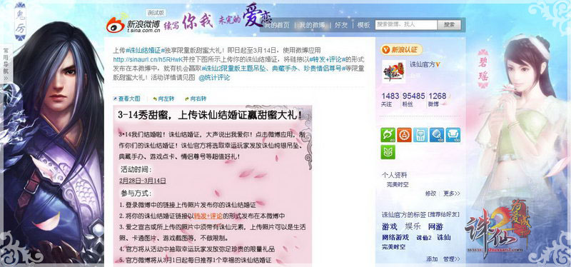 个性结婚证亲手制作,《诛仙2》白色情人节送甜蜜大礼!即日起至3月14日,登录http://zhuxian.wanmei.com/news/gamenews/20110228/58954.shtml 《诛仙2》官方活动地址,按照活动要求上传你的诛仙结婚证,就能赢取有机会赢取《诛仙2》限量版主题吊坠、典藏手办、稀有情侣尊