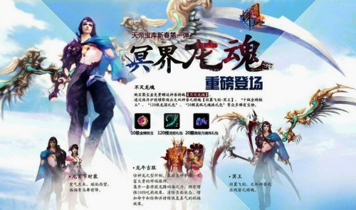 乘着龙魂之翼“冥王”,在玄幻世界自由飞翔! 现在进入“天帝宝库”寻得“聚宝盆”即可免费获赠神兽精魄“不灭龙魂”,通过炼丹炉能祭炼出龙魂羽翼“冥王”、金精铁玉(10级)、120根龙筋礼包、20颗高级元魂珠礼包、琳琅璧盒、琼华锦囊等众多稀有珍宝! 点击图片,进入专题页了解更多精彩内容