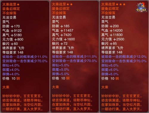 通过充值回馈免费获取的“乾坤印·三光聚现”、“乾坤印·六气蕴灵”等玺绶装备,可在河阳 尧敦木(170,175)处进行升级强化操作,让你轻松拥有强悍战斗力! 【顶级罡气、属性坐骑,轻松拥有】 在混沌造化道人处使用大乘战罡和大乘战罡进化卷,可将大乘战罡最高提升至大乘战罡★★★,助你拥有顶级战斗力开启觉醒宝盒(500积分即可换取),你就能获取大乘战罡进化卷、属性坐骑墨金麒麟、金身法身顶级强化秘宝等20多种神兵利器之一。属性坐骑墨金麒麟,让你时刻彰显独特个性! 墨金麒麟坐骑,彰显个性助力战斗 小提示:如果大乘战罡有灌注属性,在进行升级时可以放入2级混元天晶保留灌注等级。兑换大乘战罡进化卷会额外赠送一个2级混元天晶,请在及时进行兑换操作以免造成损失。 顶级战罡“大乘战罡”强化升级,PK更给力 |
