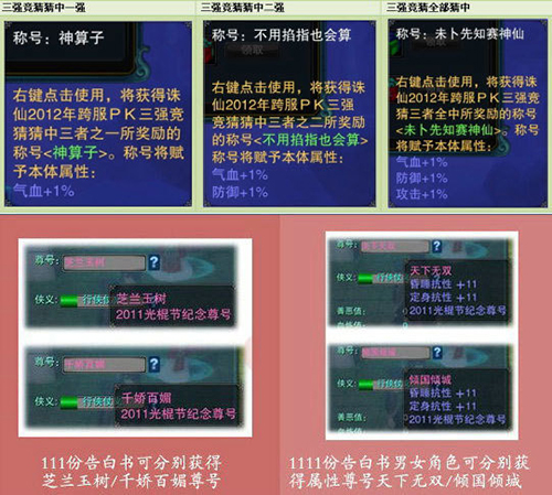 3D玄幻网游巨制《诛仙2(微博)》在2012年相继推出“时光之书”、“末日与曙光”、“灵族秘库”重量级资料片,以丰富的玩法吸引着越来越多新老玩家关注的目光,修真王者层出不穷。细数年度荣耀尊号,它们象征着你的哪一项独特成就?