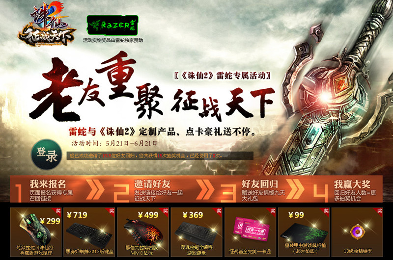 重聚诛仙 共战天下 新服冲级 舍我其谁——新版公测,将开启多组新服,迎接新老玩家的到来。2800超值礼包来玩就送,一路保送你满级!冲级大赛也将全面开幕,雷蛇专业键鼠套装等千万豪礼等你领取! 老友重聚 征战天下——新版公测,邀请老友回归诛仙,即有机会获得多款大礼:《诛仙2》雷蛇定制套装、10级铁玉、千元点卡免费送出!同时,所有创建1年以上的账号,在公测之后还可以领取诛仙六周年荣耀献礼,经验、装备、造化珠、元神珠海量奉上。 5月28日,《诛仙2·征战天下》即将震撼开幕!在接下来的日子里,官方网站将逐日详解“征战天下”的所有核心玩法,全面介绍新版豪礼领取攻略。更多精彩内容,请持续关注《诛仙2·征战天下》官方网站! [编辑:魅瞳]